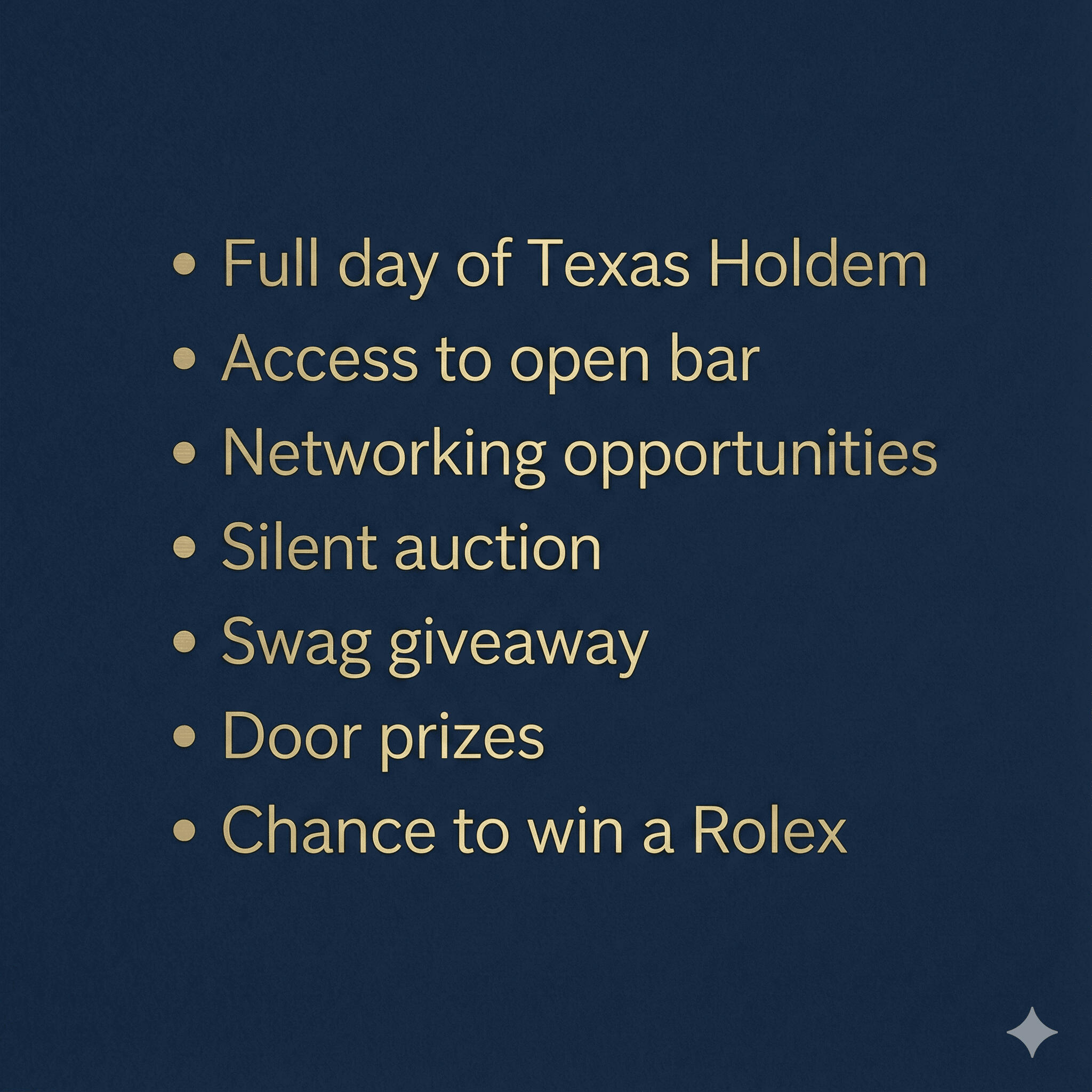 Join us for an unforgettable evening at the Cards for a Cause charity poker tournament benefiting Stronger Than My Father which is a 501(c)(3) that operates in Nashville. This high stakes event blends excitement and impact, offering a full day of tournament style poker and the chance to win incredible prizes, including a Rolex for the tournament winner, all while raising money to build a stronger community.